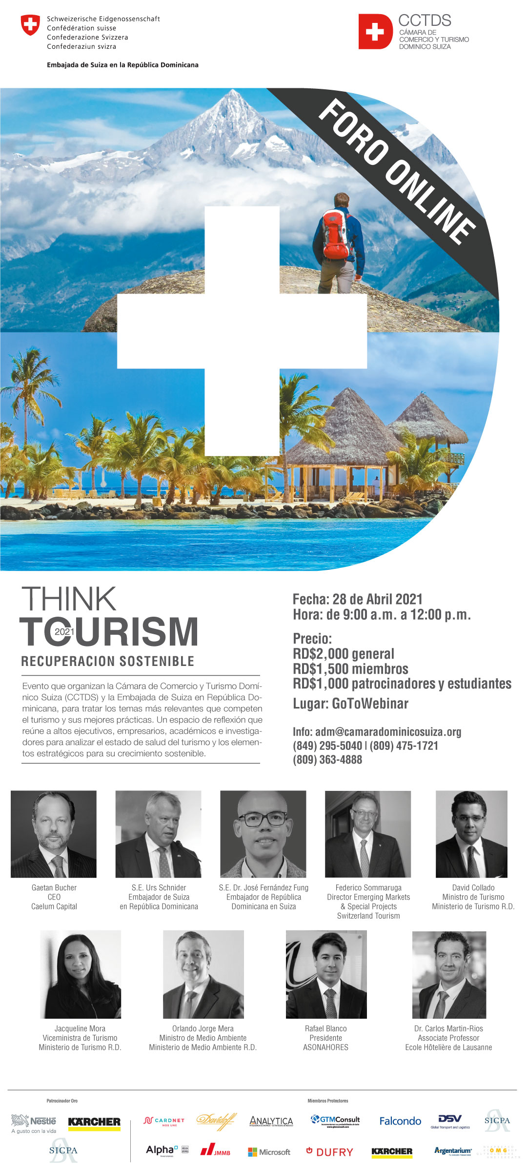 La Cámara de Comercio y Turismo Domínico Suiza (CCTDS), de la mano de la Embajada de Suiza en República Dominicana, organizan la versión virtual del principal evento anual sobre el turismo con el título: #THINKTOURISM2021 #recuperaciónsostenible de la mano de especialistas locales e internacionales, la hoja de ruta para una recuperación turística sostenible.